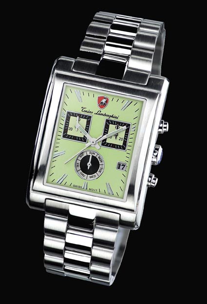 Professional and  Edgy, this Tonino Lamborghini Swiss made timepiece fits it all. The Chronograph has updated square eyes with a round dial showing the day of the week. Water Resistant to 50 meters or 165 feet this watch is never short on style. The movement is Swiss ISA 8172.202, Chronograph Quartz, 6 hand.