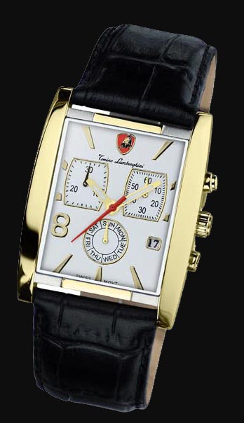 Professional and Edgy, this Tonino Lamborghini Swiss made timepiece fits it all. The Chronograph has updated square eyes with a round dial showing the day of the week. Stainless Steel case with 18k gold plate bring this watch to the front. Band is Italian Leather. Water Resistant to 50 meters or 165 feet this watch is never short on style. The movement is Swiss ISA 8172.202, Chronograph Quartz, 6 hand.