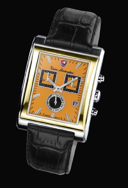 Professional and  Edgy, this Tonino Lamborghini Swiss made timepiece fits it all. The Chronograph has updated square eyes with a round dial showing the day of the week. Stainless Steel case with 18k gold plate bring this watch to the front. Band is Italian Leather. Water Resistant to 50 meters or 165 feet this watch is never short on style. The movement is Swiss ISA 8172.202, Chronograph Quartz, 6 hand.