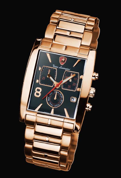 Professional and  Edgy, this Tonino Lamborghini Swiss made timepiece fits it all. The Chronograph has updated square eyes with a round dial showing the day of the week. Stainless Steel band and case with 18k Rose Gold plate bring this watch to the front. Water Resistant to 50 meters or 165 feet this watch is never short on style. The movement is Swiss ISA 8172.202, Chronograph Quartz, 6 hand.