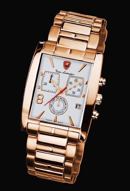 Professional and Edgy, this Tonino Lamborghini Swiss made timepiece fits it all. The Chronograph has updated square eyes with a round dial showing the day of the week. Stainless Steel band and case with 18k Rose Gold plate bring this watch to the front. Water Resistant to 50 meters or 165 feet this watch is never short on style. The movement is Swiss ISA 8172.202, Chronograph Quartz, 6 hand.