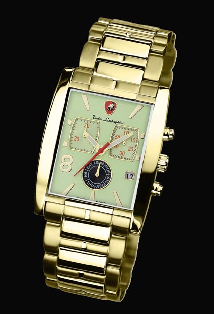 Professional and Edgy, this Tonino Lamborghini Swiss made timepiece fits it all. The Chronograph has updated square eyes with a round dial showing the day of the week. Stainless Steel band and case with 18k Gold plate bring this watch to the front. Water Resistant to 50 meters or 165 feet this watch is never short on style. The movement is Swiss ISA 8172.202, Chronograph Quartz, 6 hand.