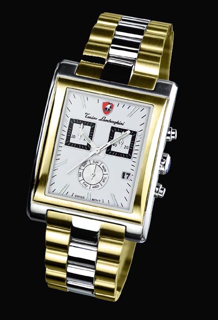 Professional and  Edgy, this Tonino Lamborghini Swiss made timepiece fits it all. Stylish combination of polished and brushed finish in band with gold plate. The Chronograph has updated square eyes with a round dial showing the day of the week. Water Resistant to 50 meters or 165 feet this watch is never short on style. The movement is Swiss ISA 8172.202, Chronograph Quartz, 6 hand.