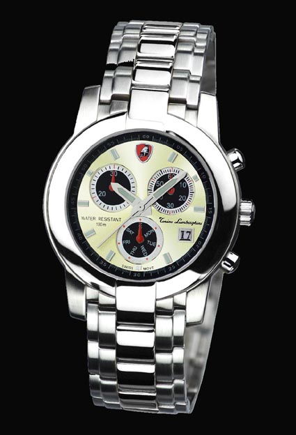This Swiss timepiece by Tonino Lamborghini is striking and classic in is design. The Swiss made Technotime 7536B, Multifunction Quartz, 6 hand movement is incased in stainless steel and some models even have gold plate for added attractiveness. These models are water resistant to 100 meters or 330 ft. Choose your model today.