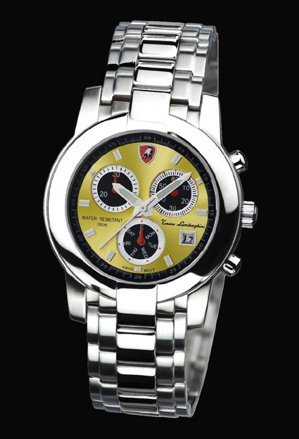 This Swiss timepiece by Tonino Lamborghini is striking and classic in is design. The Swiss made Technotime 7536B, Multifunction Quartz, 6 hand movement is incased in stainless steel and some models even have gold plate for added attractiveness. These models are water resistant to 100 meters or 330 ft. Choose your model today.