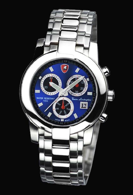 This Swiss timepiece by Tonino Lamborghini is striking and classic in is design. The Swiss made Technotime 7536B, Multifunction Quartz, 6 hand movement is incased in stainless steel and some models even have gold plate for added attractiveness. These models are water resistant to 100 meters or 330 ft. Choose your model today.