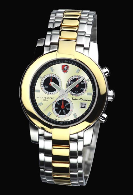 This Swiss timepiece by Tonino Lamborghini is striking and classic in is design. The Swiss made Technotime 7536B, Multifunction Quartz, 6 hand movement is incased in stainless steel and some models even have gold plate for added attractiveness. These models are water resistant to 100 meters or 330 ft. Choose your model today.