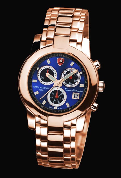 This Swiss timepiece by Tonino Lamborghini is striking and classic in is design. The Swiss made Technotime 7536B, Multifunction Quartz, 6 hand movement is incased in stainless steel and some models even have gold plate for added attractiveness. These models are water resistant to 100 meters or 330 ft. Choose your model today.