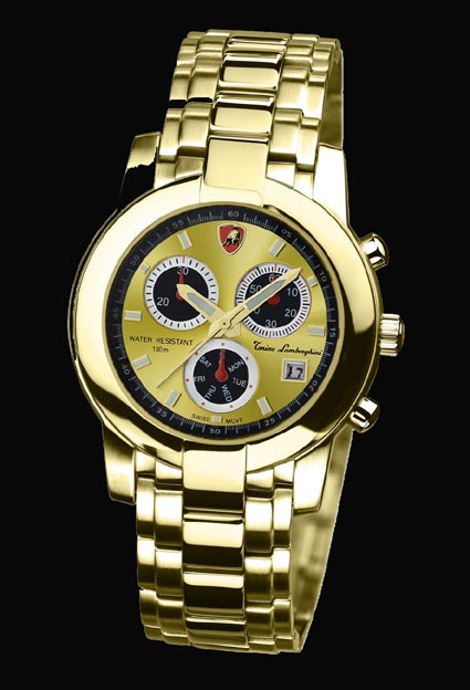 This Swiss timepiece by Tonino Lamborghini is striking and classic in is design. The Swiss made Technotime 7536B, Multifunction Quartz, 6 hand movement is incased in stainless steel and some models even have gold plate for added attractiveness. These models are water resistant to 100 meters or 330 ft. Choose your model today.