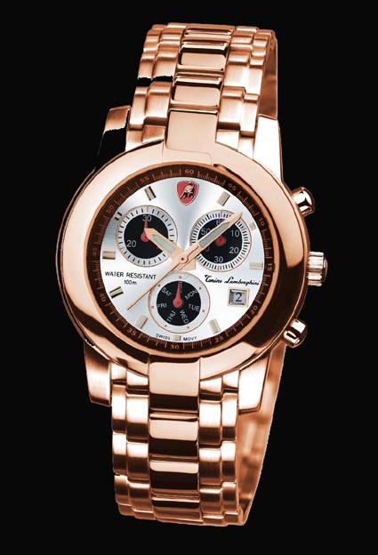 This Swiss timepiece by Tonino Lamborghini is striking and classic in is design. The Swiss made Technotime 7536B, Multifunction Quartz, 6 hand movement is incased in stainless steel and some models even have gold plate for added attractiveness. These models are water resistant to 100 meters or 330 ft. Choose your model today.
