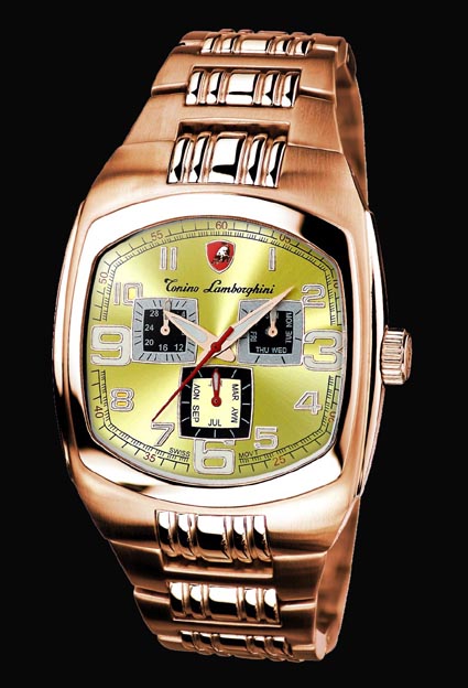 For the perfect harmony of style and function, Tonino Lamborghini developed the S106. The square eyed multifunction dial really puts you fashion forward. This Swiss timepiece comes in all stainless or a Gold Plate or Rose Gold Plate version. Water Resistant to 100 meters or 330ft this watch really performs.